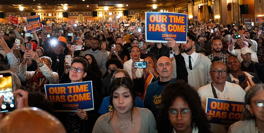 Attendees hold signs during a campaign rally with Zohran Mamdani, New York City mayoral candidate, not pictured, at United Palace in New York, US, on Monday, Oct. 13, 2025. Millions of dollars are pouring into the mayoral election with less than four weeks to go until New Yorkers go to the polls. Photographer: Christian Monterrosa/Bloomberg